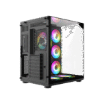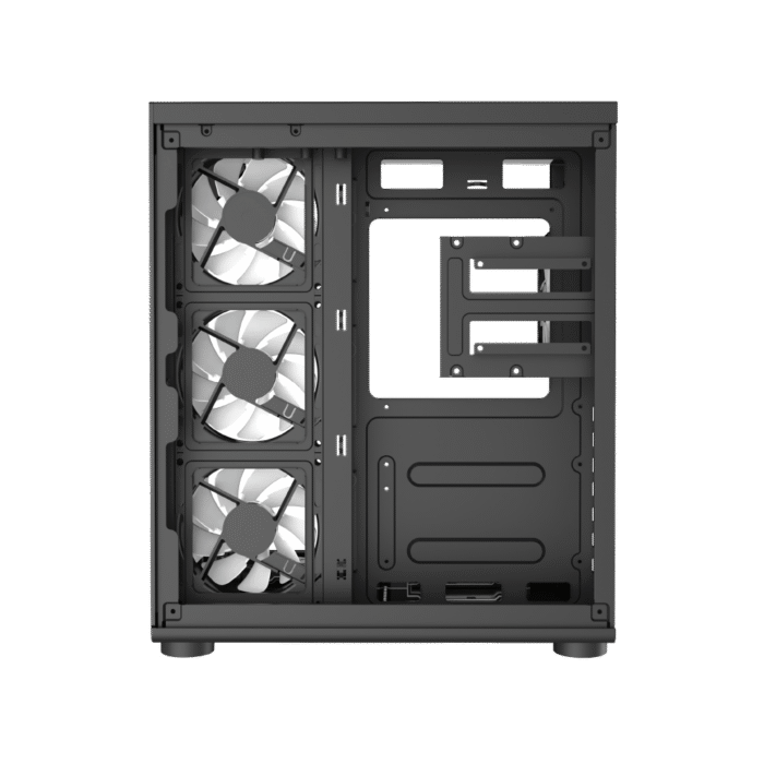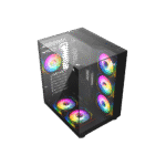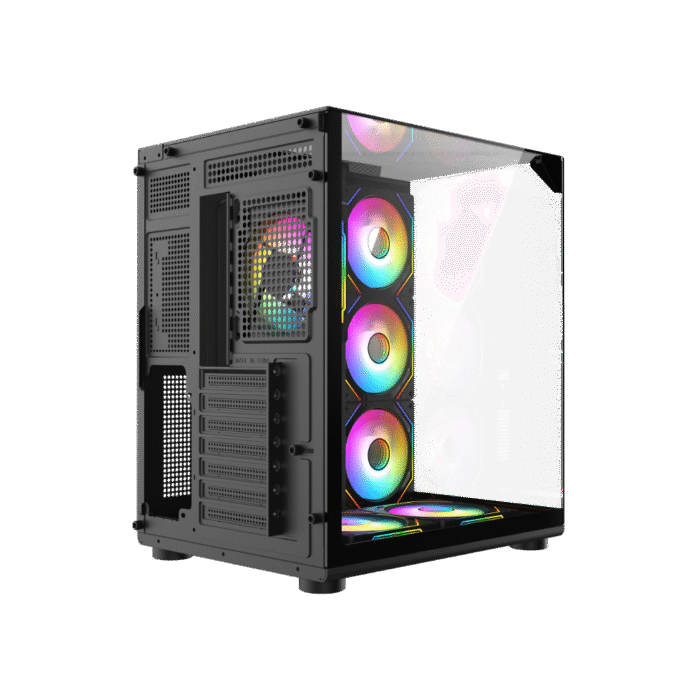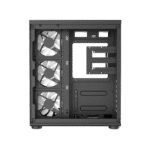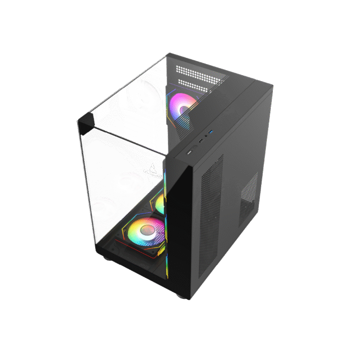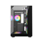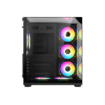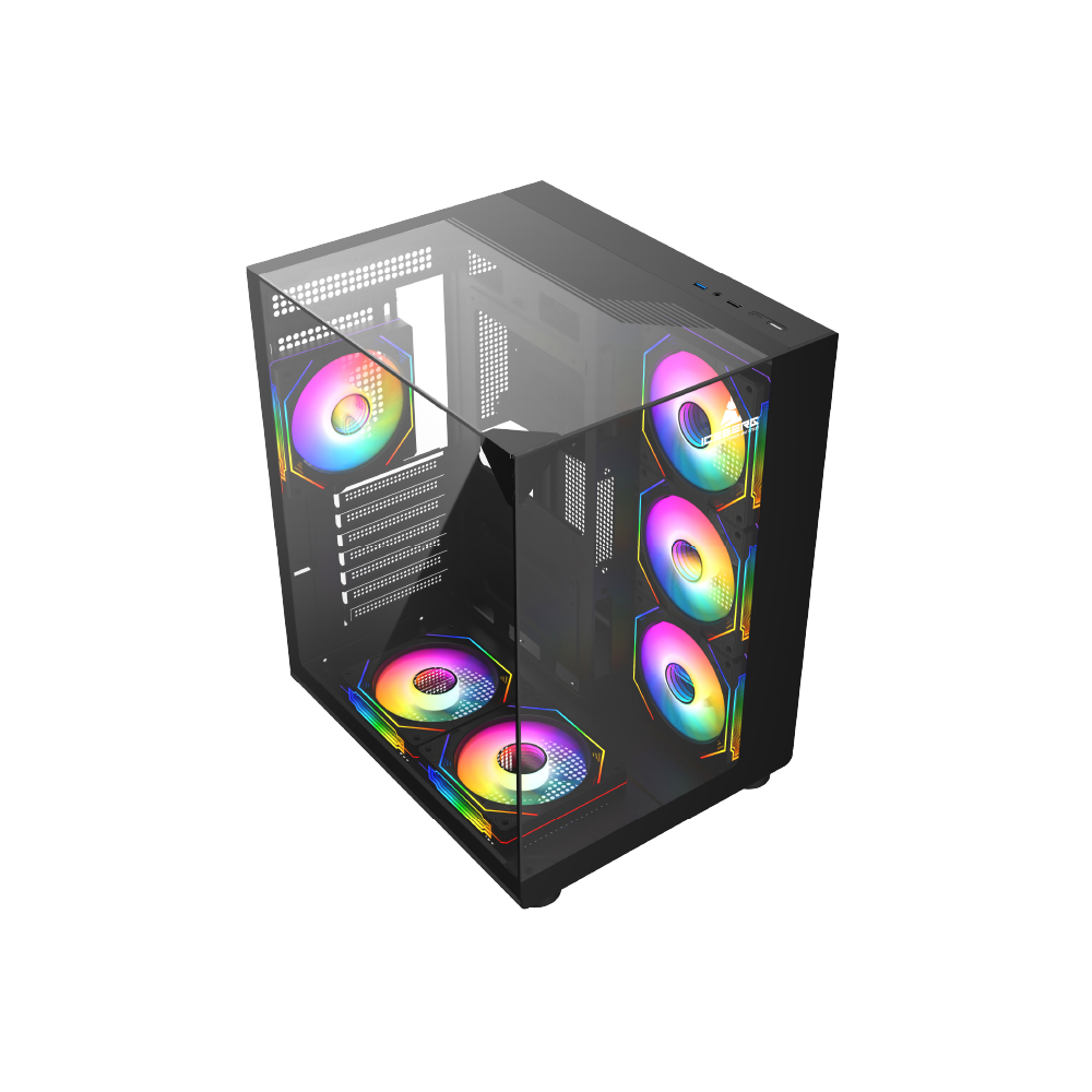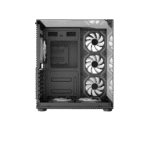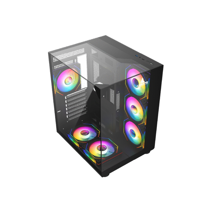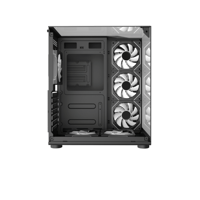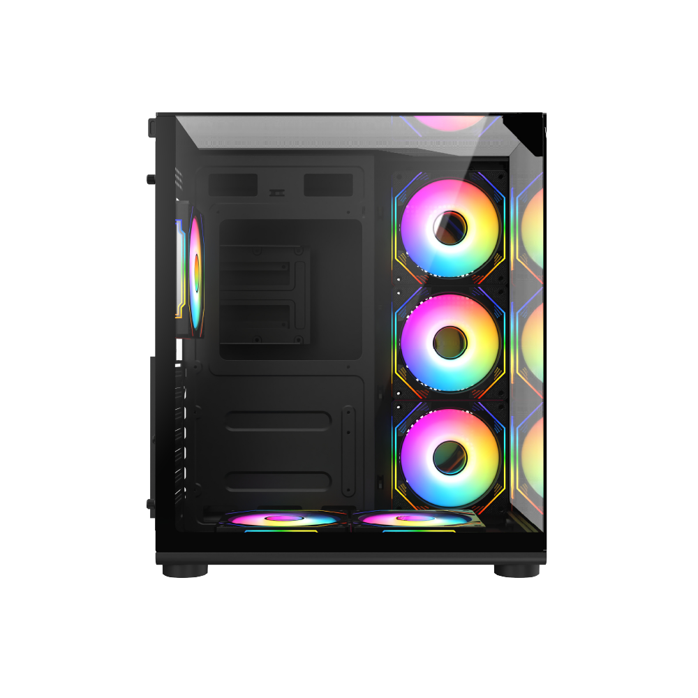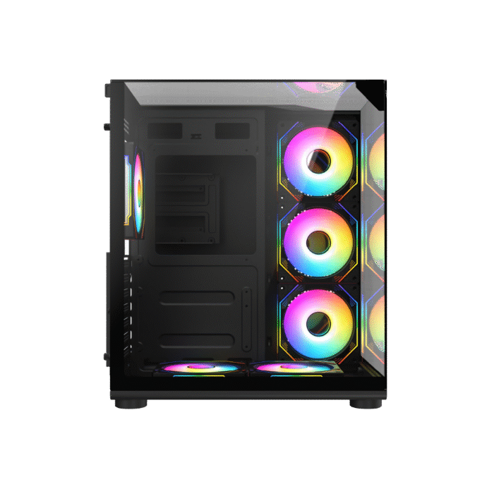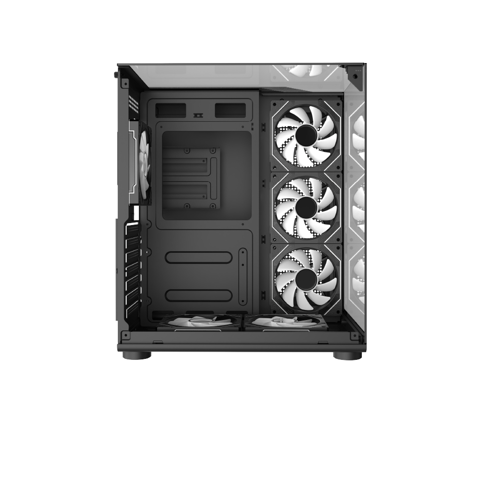 Viene equipado con 6 ventiladores aRGB de 120mm con doble anillo infinity, ofreciendo una excelente ventilación desde el primer momento y un acabado visual ideal para setups con estética RGB. El sistema de ventilación no requiere ajustes adicionales y se complementa con soporte para refrigeración líquida de hasta 240mm en el lateral, maximizando la capacidad de enfriamiento del equipo.